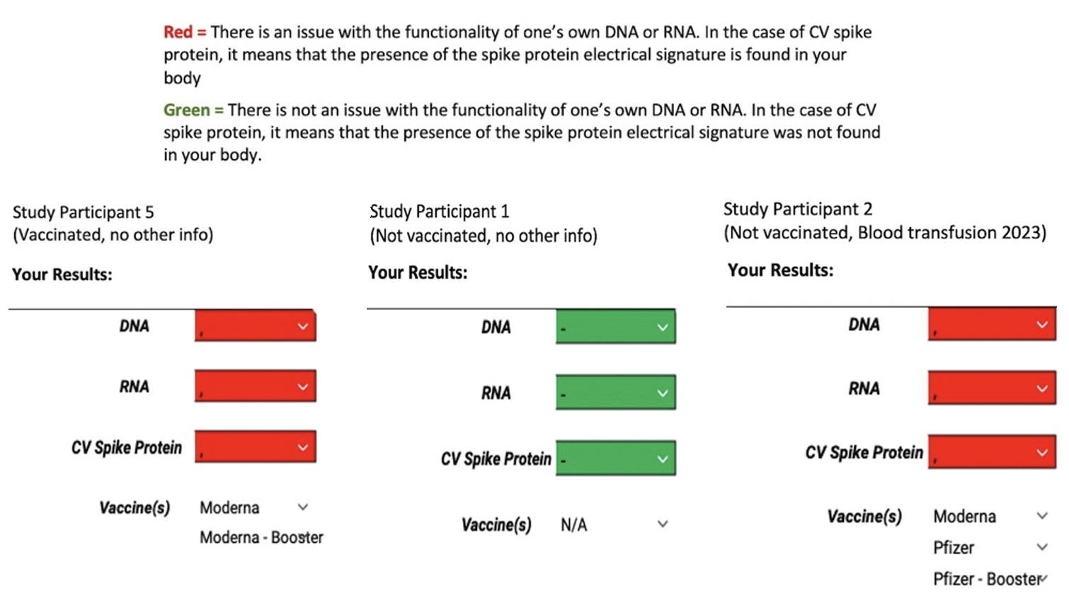 Here you can see not only that the “vaccination” has damaged DNA and RNA, but above all that an unvaccinated person has the same values after a transfusion as a vaccinated person. This is dynamite.